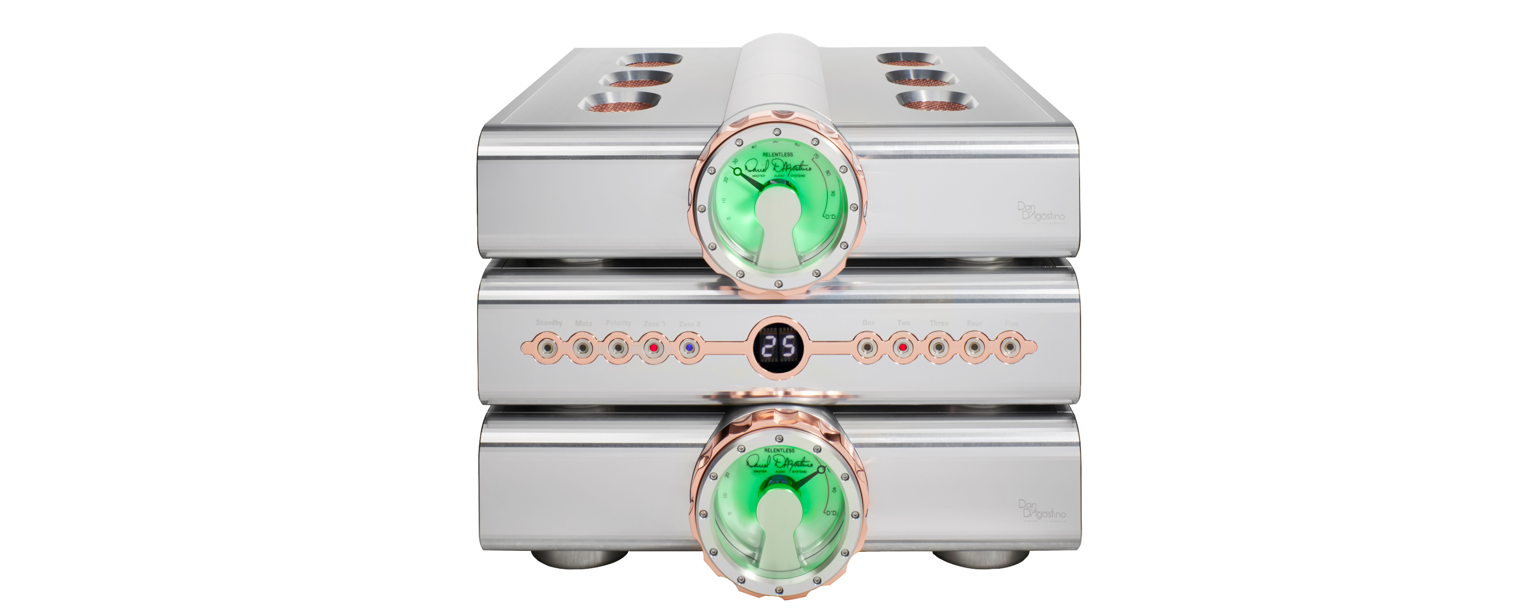 Il nuovo Preamplificatore Relentless è il massimo dell'innovazione nel design dei preamplificatori. Il preamplificatore svolge un ruolo critico nella riproduzione di musica; infatti, in fase di riproduzione il segnale musicale è particolarmente suscettibile a compromessi dovuti al rumore e alla distorsione. L'utilizzo di tre diversi chassis nel design del preamplificatore Relentless - un chassis audio dedicato per ogni canale, separato da una sezione di controllo e di alimentazione - affronta questi problemi e porta anche altri vantaggi.