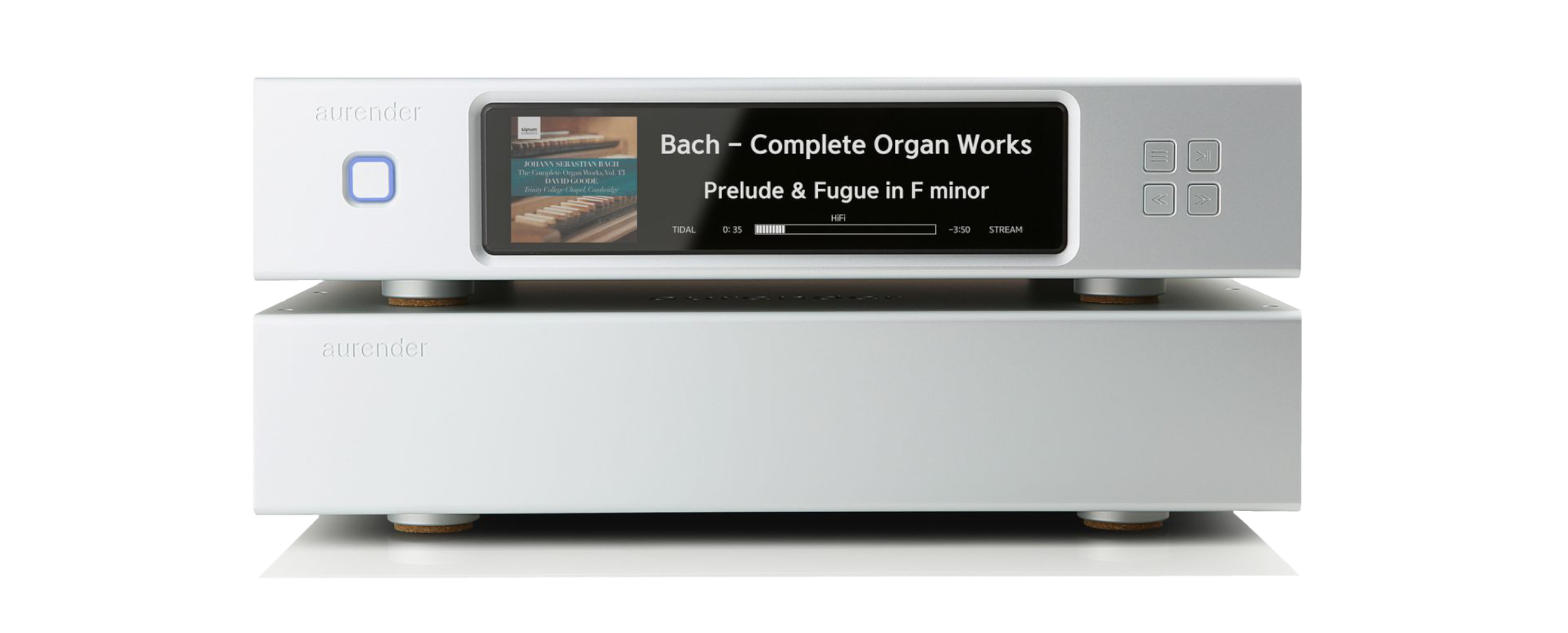 Specifiche fisiche Dimensioni 2x 16.9"L x 14"D x 4.2"H (3.7"H w/ o piedi) Peso 48,5 lb Materiale doppio telaio in alluminio lavorato  Display del pannello frontale 8,8" 1920 x 480 Ampio LCD a colori IPS   Specifiche tecniche Alimentazione 1x50W (CPU), 2x35W (4 core) per scheda di uscita digitale CPU Intel Quad Core a bassa potenza RAM 8GB Capacità di archiviazione libreria 8TB, 1X 2,5" Vano (User-Installable Storage) SSD per sistema e cache 480GB NVME Porte USB dati 2X USB 3.0 (posteriore) Software Suite Aurender Conductor Porta Ethernet Gigabit LAN a doppio isolamento Gruppo di continuità (UPS)  Sì (Super condensatori) Consumo energetico Play (40W), Picco (70W), Standby (3.5W) Capacità di estrazione del CD N/A Specifiche audio Uscite analogiche N/A DAC Chipset N/A Orologio Word audio OCXO Rev2 Formato N/A supportato da uscite analogiche Uscite digitali USB Audio (dedicato), AES/EBU (controllato OCXO), BNC Coax SPDIF (controllato OCXO), RCA Coax SPDIF (controllato OCXO), ottico/Toslink SPDIF (controllato OCXO) Formato di uscita USB supportato fino a 32 bit / 384kHz, DSD128 (DoP), DSD512 (nativo) SPDIF & AES/EBU Formato di uscita supportato PCM: fino a 32 bit / 192 kHz; DSD: fino a DSD64 tramite DoP Ingressi digitali N/A Sezione cuffie N/A Master Clock Input coassiale BNC 75Ω - 10MHz, 12.8MHz, 44.1-48kHz (multipli da 1-512x) MQA Supporto MQA Core-Decoder Aggiornamento disponibile Formati compatibili DSD (DSF, DFF), WAV, FLAC, AIFF, ALAC, M4A, APE e altri Conversione da DSD a PCM N/A