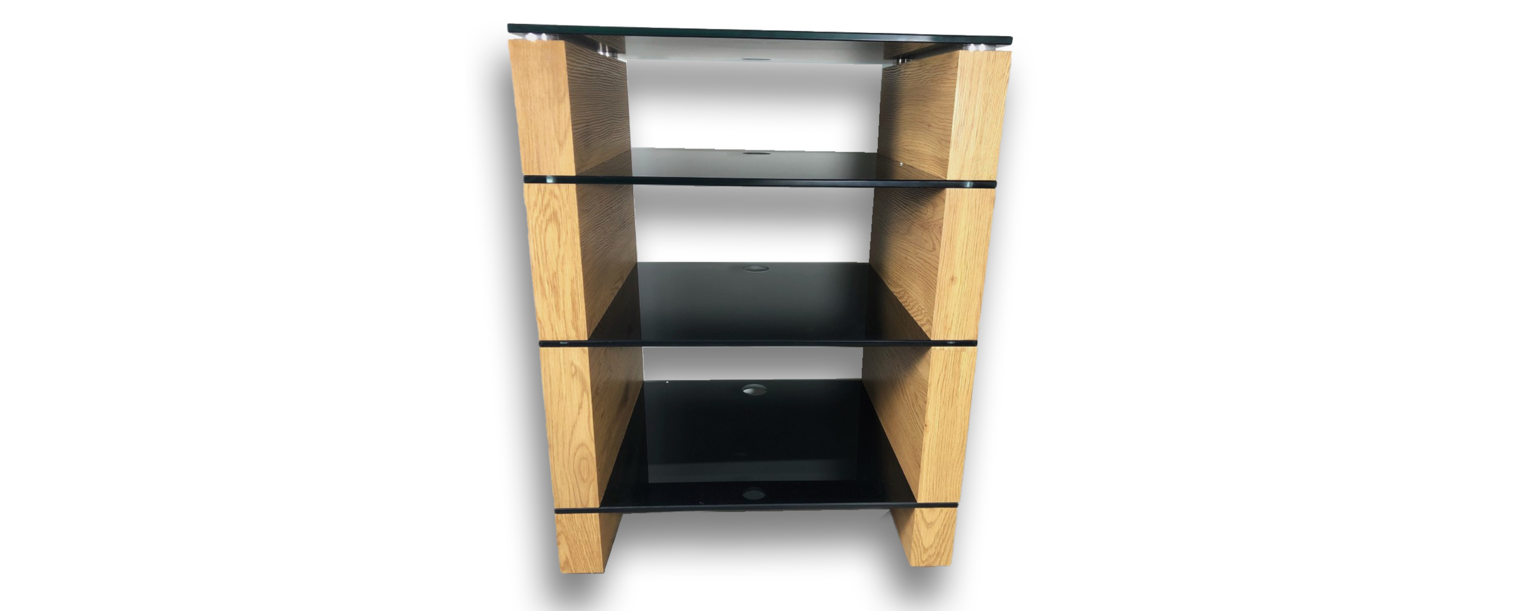 MDF con vetro temperato nero o satinato. Mobiletto a 4 strati con capacità di carico di 40 kg per ripiano. Questo mobiletto gestisce la disposizione dei cavi per ogni ripiano (ogni lastra di vetro ha un foro sul retro per i cavi).