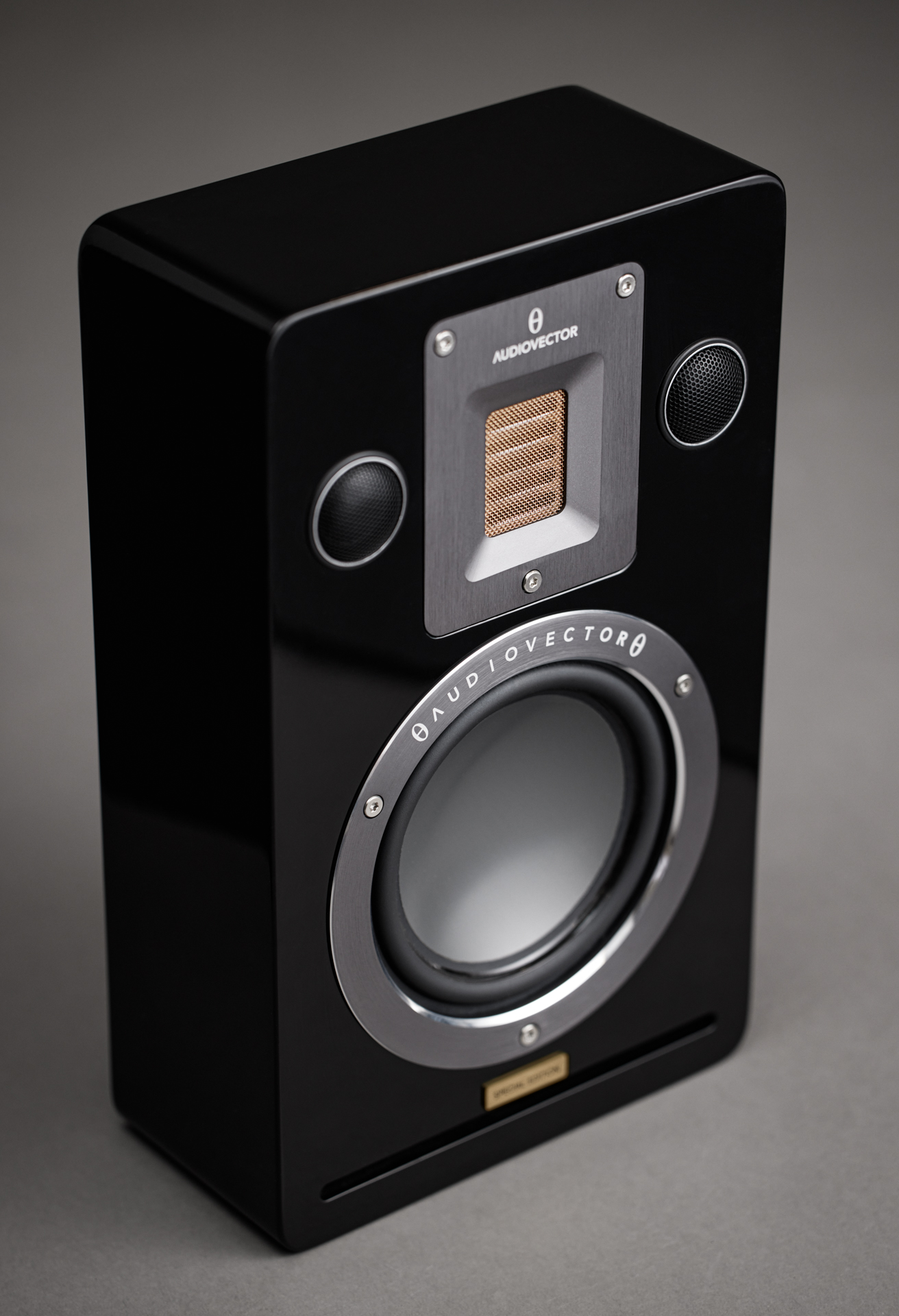 La piastra frontale del nostro Tweeter Gold Leaf Air Motion è ricavata da un unico blocco di alluminio di grado aerospaziale. Viene lavorata con precisione, sabbiata con vetro, spazzolata e poi anodizzata in un elegante grigio titanio tungsteno. Presenta una griglia di dispersione placcata in oro rosa, che funge da filtro S-Stop.