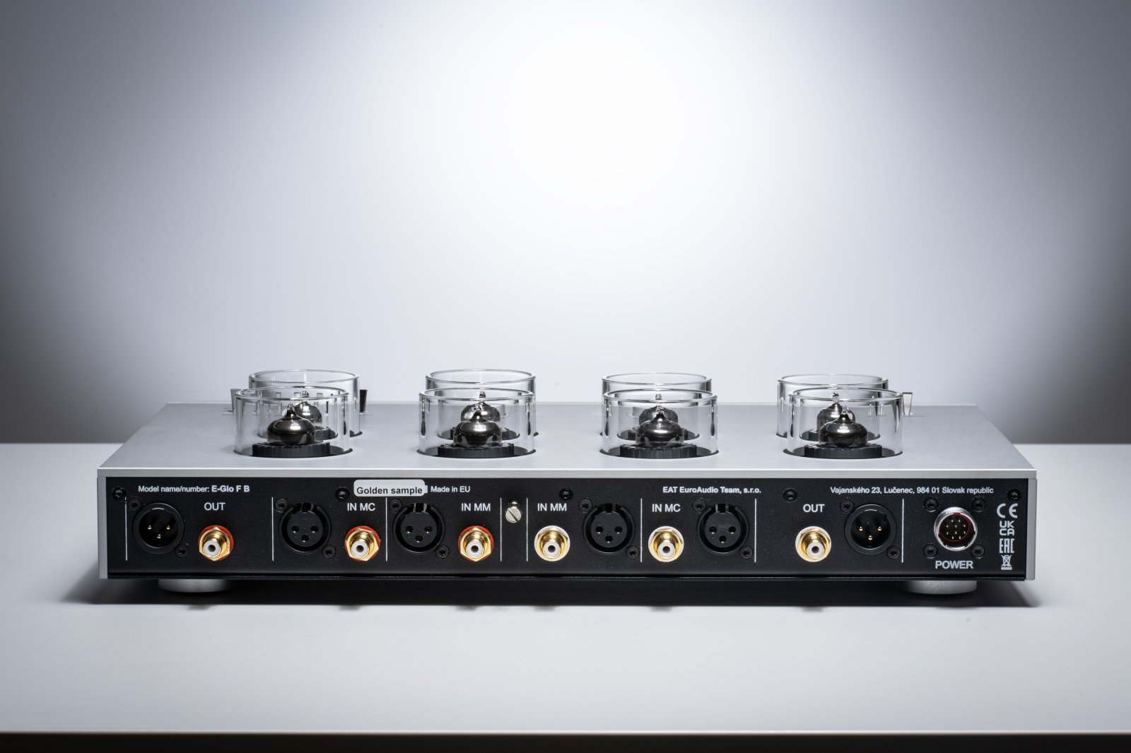 Presentato per la prima volta al CES di Las Vegas nel gennaio 2013, l’E.A.T. E‑Glo ha segnato un’importante evoluzione con il lancio dell’E‑Glo 2, dieci anni dopo il debutto del modello originale. Sulla scia dei predecessori, il nuovo E‑Glo F B è uno stadio phono interamente a valvole, completamente privo di semiconduttori nel percorso del segnale. L’integrazione di due valvole ECC88 consente ora un design totalmente bilanciato, con funzionamento completamente bilanciato attraverso tutte le fasi di amplificazione. Il set di valvole comprende quattro ECC83 e quattro ECC88, garantendo ampia disponibilità di ricambi e offrendo agli appassionati la libertà di personalizzare il suono sostituendo le valvole – incluse le proposte premium firmate EAT.
