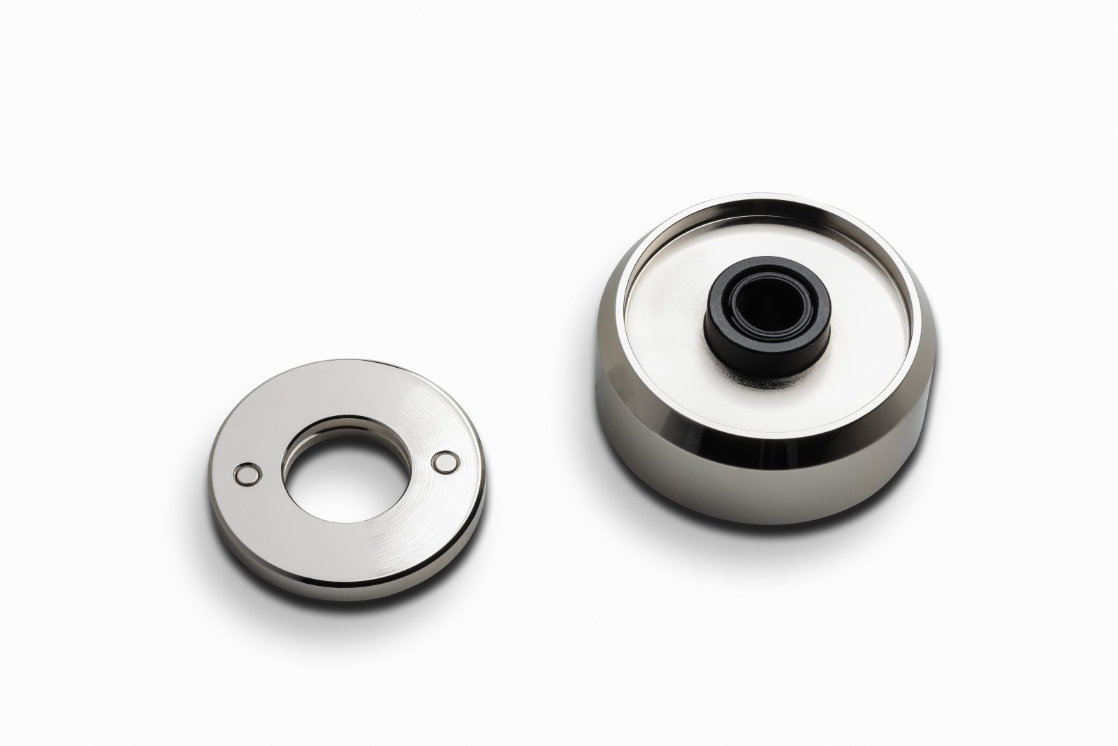 Il pesante piatto in alluminio da 5,2 kg poggia su un sottopiatto da 900 g, anch’esso in alluminio, progettato per essere privo di risonanze. Il massiccio perno principale rovesciato assicura una rotazione estremamente silenziosa e stabile. Il blocco del perno, con una massa di 1,8 kg, utilizza un perno in acciaio inox lucidato con una sfera in ceramica sulla sommità. La sfera in ceramica, grazie alla sua durezza e inerzia elevate, offre un accoppiamento estremamente stabile. Abbinata a una piastra in Teflon che funge da specchio di supporto, garantisce un efficace smorzamento delle vibrazioni. La superficie satinata del Teflon assicura un movimento perfettamente fluido e privo di rumble.